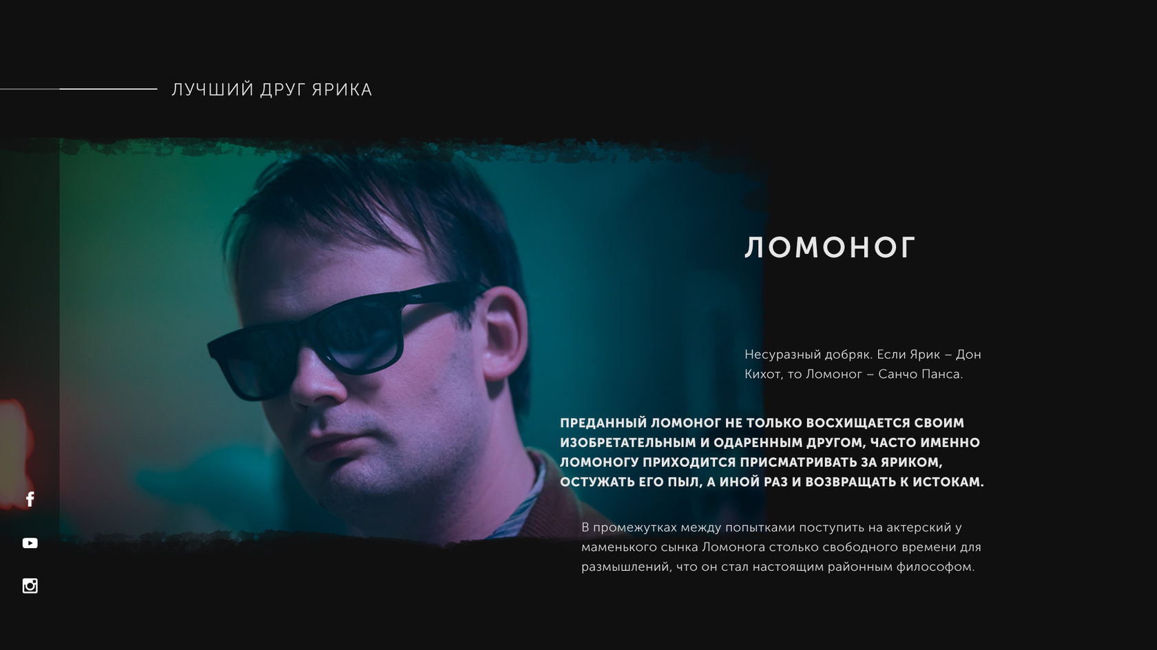 Если Ярик – Дон Кихот, то Ломоног – Санчо Панса. Ломоног преданно сопровождает Ярика повсюду и нередко именно ему приходится выручать его из очередной передряги. Пускай он нелепый, пускай живет с мамой и уже 4 года не может поступить в театральный вуз, зато одно он умеет точно - дружить.